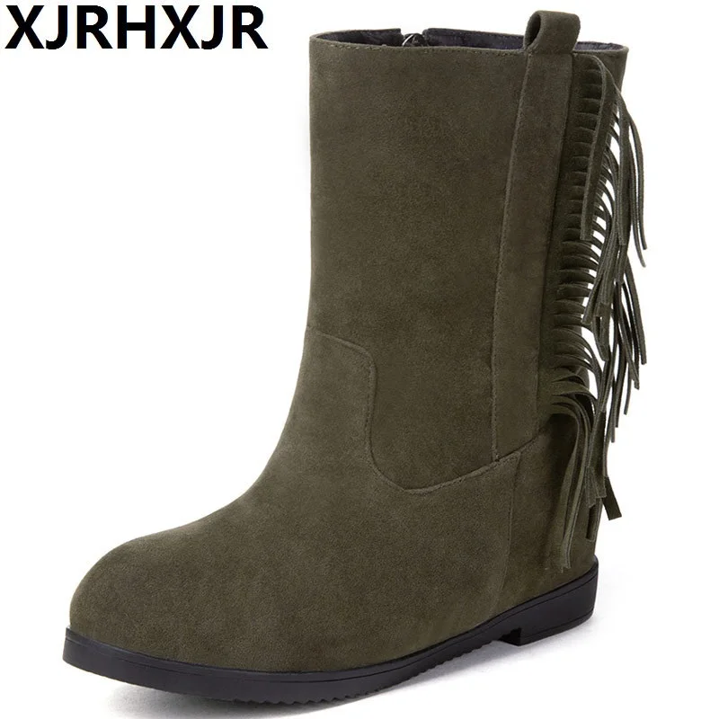 2. XJRHXJR Марка 5 см Высота ростом обувь женщина осень-зима Side Zip Boot с модой кисточкой женские замшевые на ботинки до середины икры