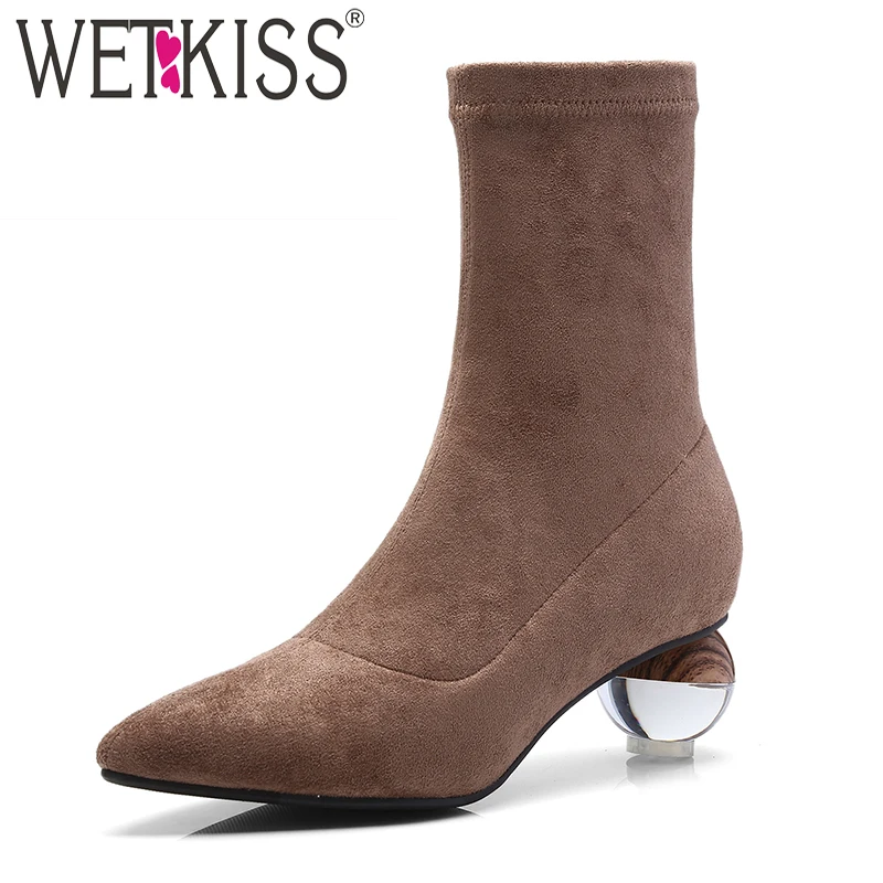 4. WETKISS/прозрачный яйцо на высоком каблуке женские ботильоны резиновые, из флока Обувь Stretch Boot черные туфли с острым носком Для женщин 2018 Новый