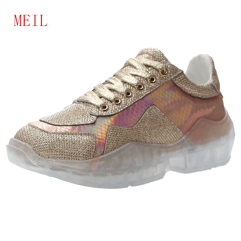 3. Серебро Золото Новые кожаные 2019 Diamond Sneaker ясно платформы вычурный женский кроссовки кружево на толстой подошве повседневная женская обувь