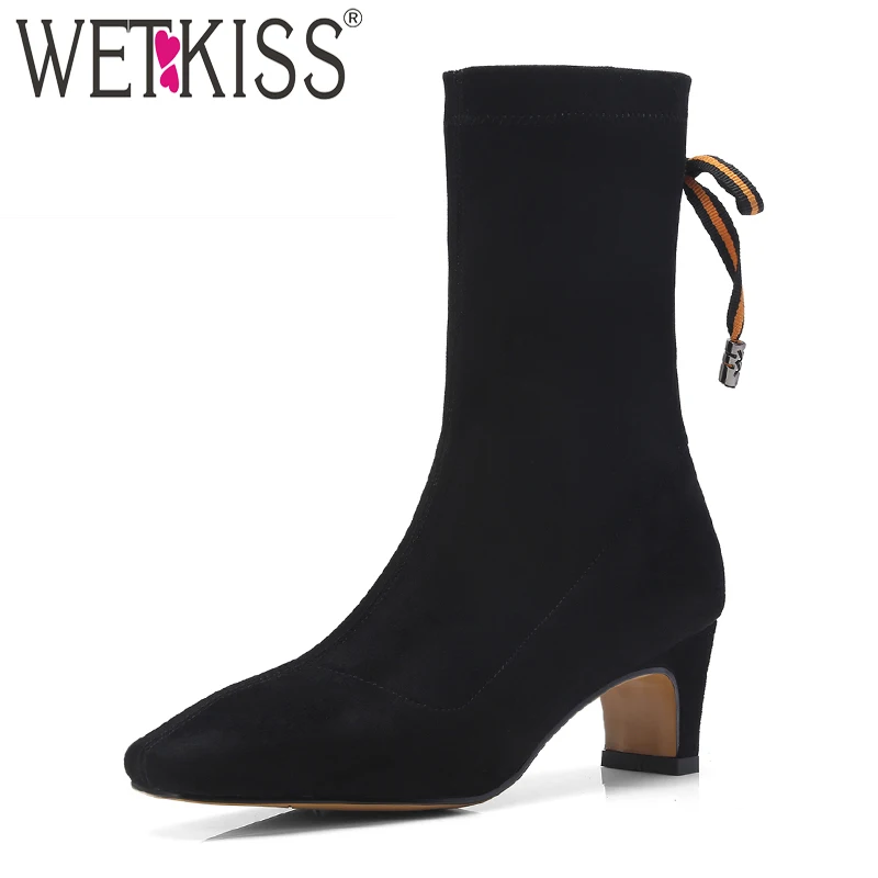2. WETKISS/новые женские ботильоны на высоких каблуках мех замша обувь с перекрестной шнуровкой резиновая Stretch Boot Обувь на квадратном каблуке Для ...