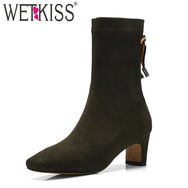 2. WETKISS/новые женские ботильоны на высоких каблуках мех замша обувь с перекрестной шнуровкой резиновая Stretch Boot Обувь на квадратном каблуке Для ...